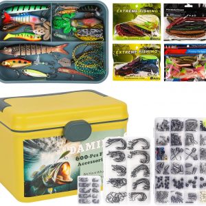 600 Pcs/Tackle Box Fishing Kit-Fishing Hooks,Sinkers, Swivels Snaps,Top Water Lure,Spoons,Soft Lures,Jig Heads, Frogs, Minnow, Accessories Equipment- Saltwater Freshwater Bass Bait Gear