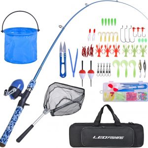 LEOFISHING Kids Fishing Pole Set with Full Starter Kits Portable Telescopic Fishing Rod and Spincast Reel with a Fishing Net and Bucket for Boys Girls and Youth