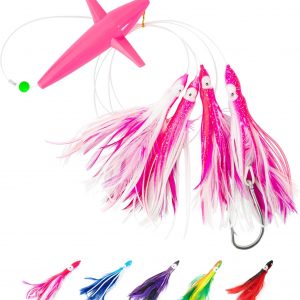 BLUEWING Tuna Feather Daisy Chain Fishing Teaser Lure with 6in Feathered Trolling Squids and Stainless Steel Hook Big Game for Tuna Mahi Wahoo Marlin, Black/Red