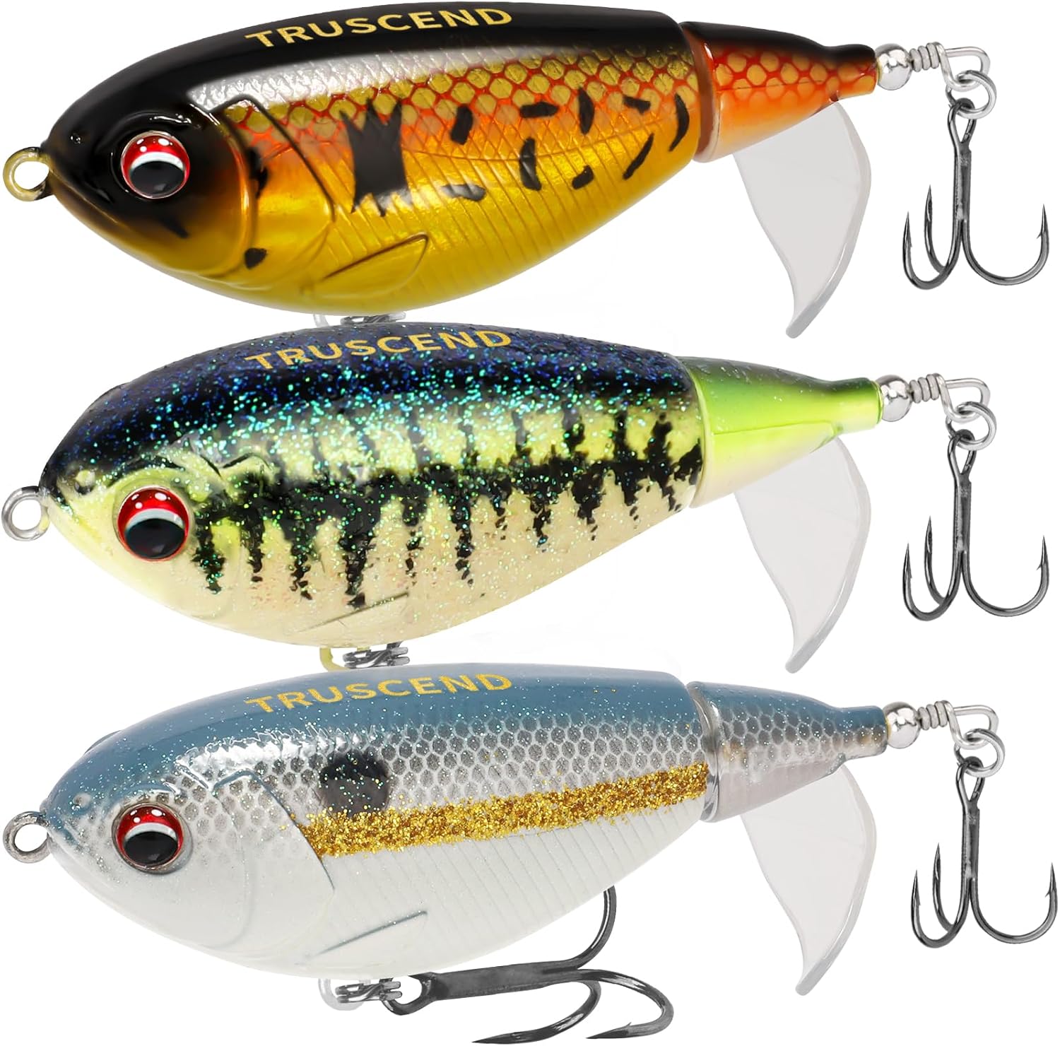 - BLADE UNIQUE DESIGN – TRUSCEND Fishing Lure Set uses a blade rotating tail design, which delivers a heavy sputter as it moves across the surface, create noise and commotion that fish can not ignore. It also “roll resistant” and works well at a variety of speeds. Interestingly, when the monster bass bites the fishing bait, its tail will close to prevent the bass from spitting it out.